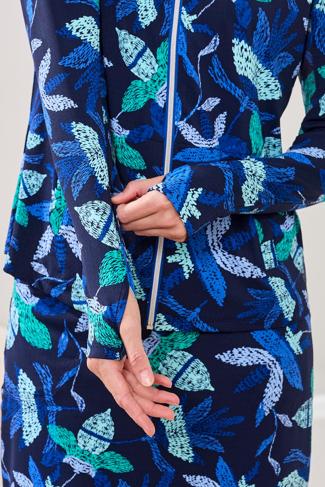 Tackle your day with this mock-neck cardigan that's moisture-wicking, fast-drying, anti-bacterial, and UPF 50+ protective. Comfortably stretchy, the textured knit fabric is available in multiple bold and floral-inspired prints. It's styled with pockets and long sleeves.