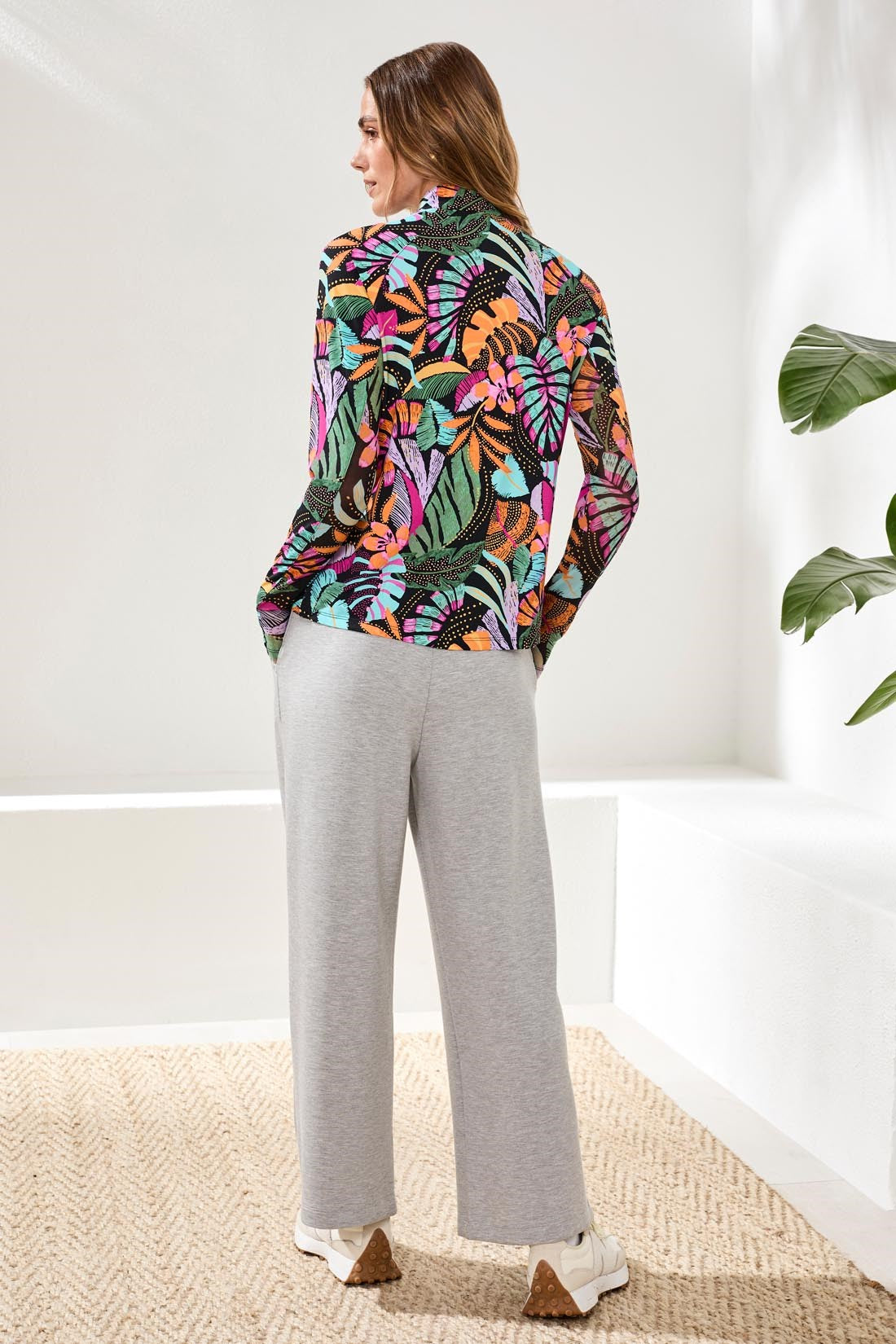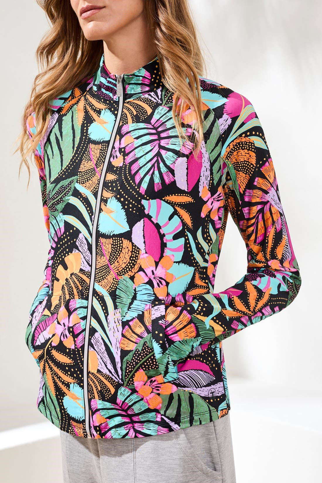 Tackle your day with this mock-neck cardigan that's moisture-wicking, fast-drying, anti-bacterial, and UPF 50+ protective. Comfortably stretchy, the textured knit fabric is available in multiple bold and floral-inspired prints. It's styled with pockets and long sleeves.