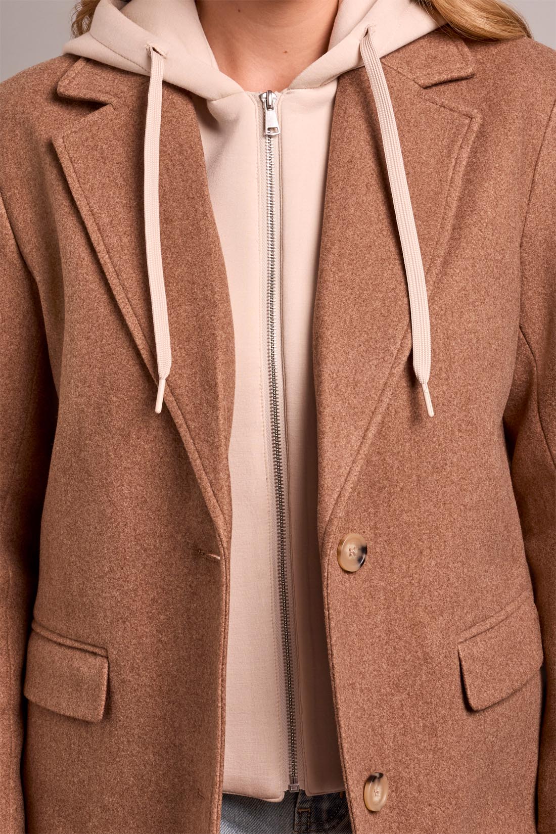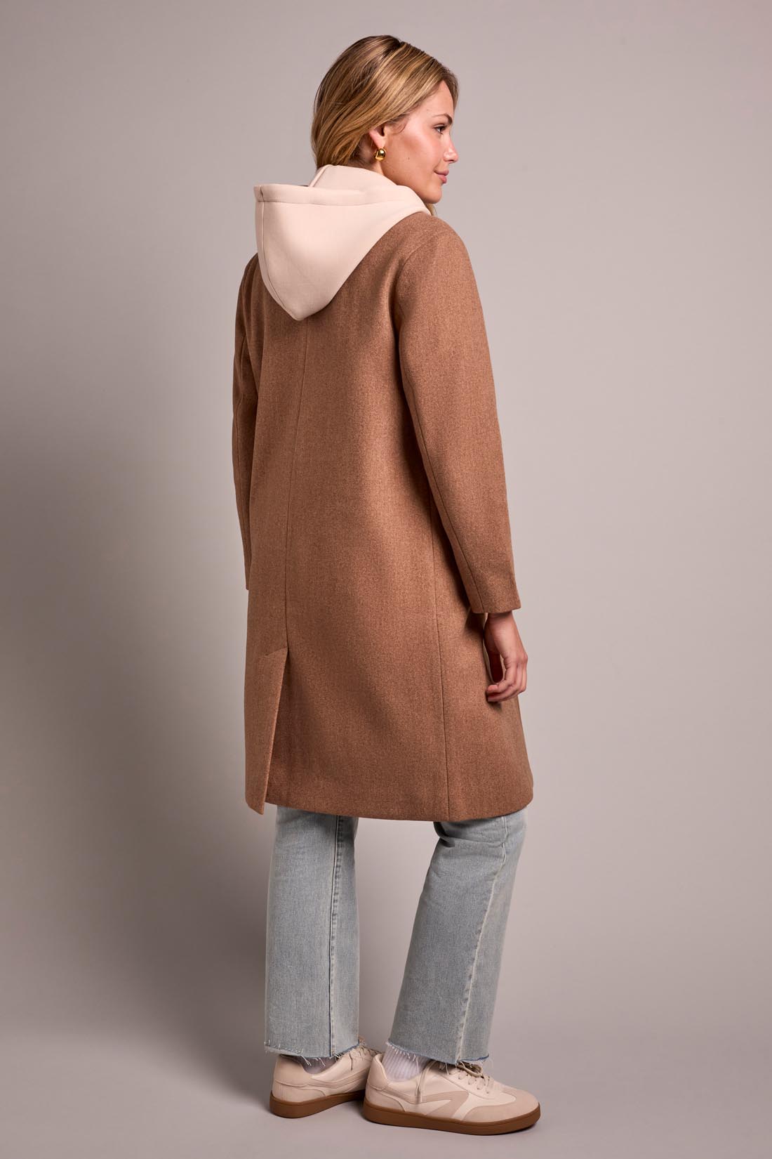Elevate your outerwear game with a modern car coat reimagined with a removable fooler hoodie for a layered, street-style edge. The buttoned front and sharp notch lapels lend timeless sophistication, while side pockets offer functional ease, blending utility and style for an effortlessly polished finish. Can be dressed-up or dressed down by adding or simply removing the hoodie.