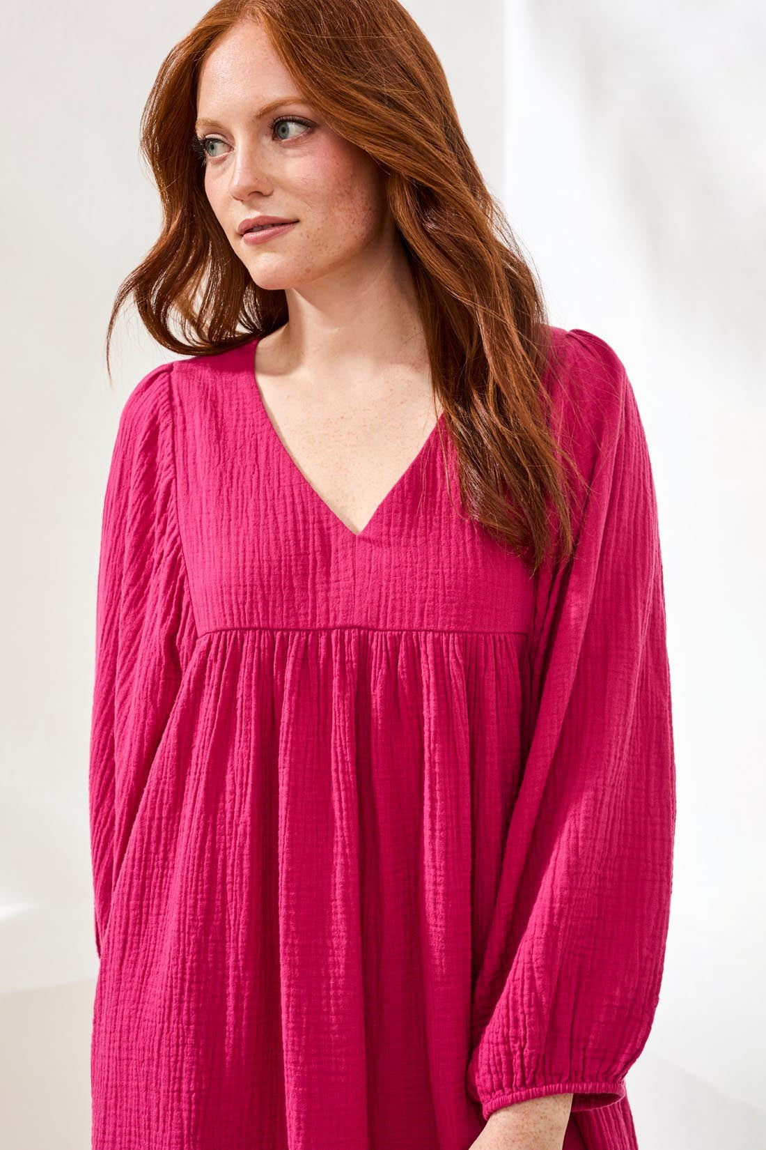 Add a modern twist to your spring wardrobe with this puff sleeve dress in lightweight crinkled gauze. The relaxed silhouette and breathable fabric make it perfect for warmer days, offering comfort, fluid movement, and an effortlessly polished finish for every occasion.