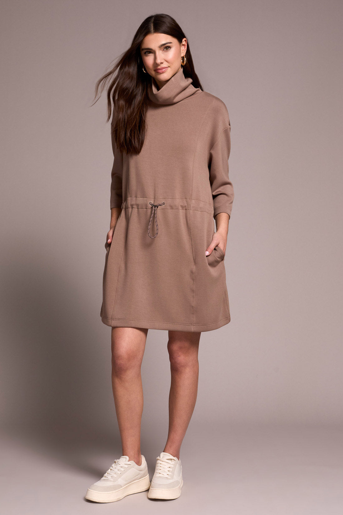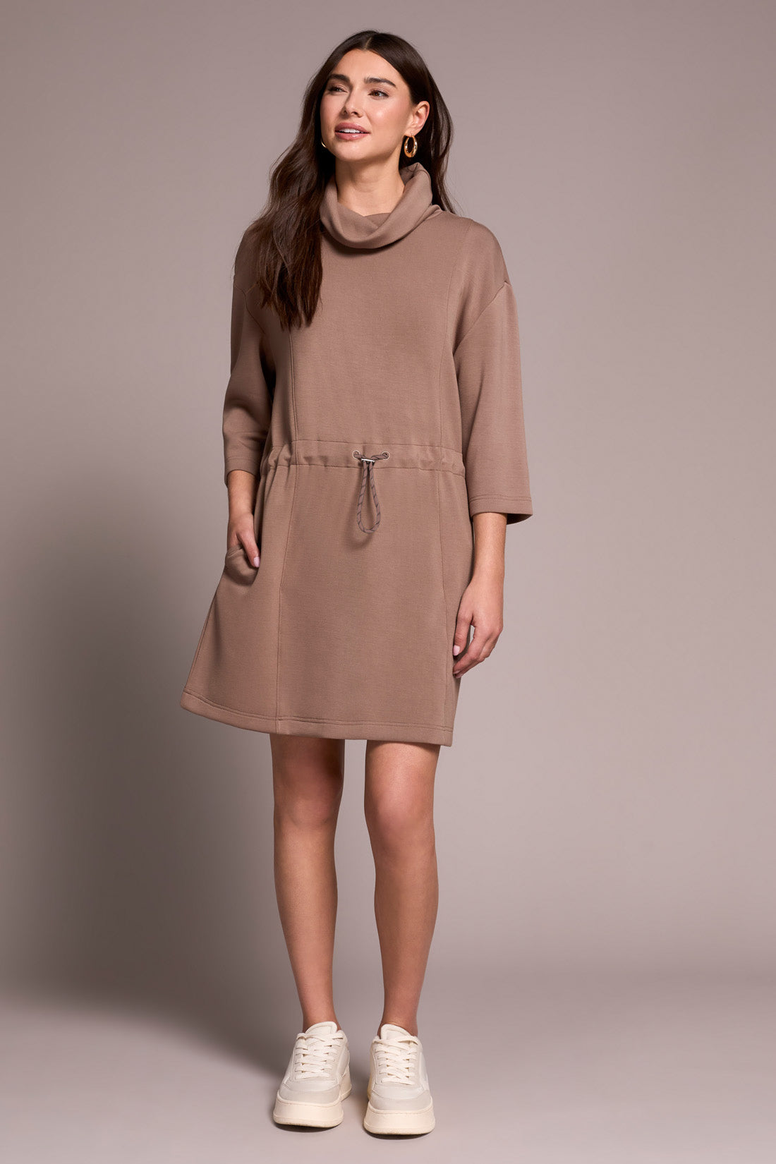 Embrace effortless style in this relaxed dress crafted from soft Techno Lux fabric with four-way stretch, ensuring comfort and freedom of movement. The adjustable drawcord at the waist allows for a customized fit, while the three-quarter length sleeves offer the perfect amount of coverage. The cozy funnel neck adds an extra touch of warmth for cooler days.
