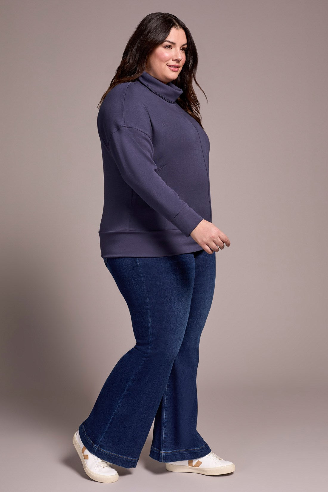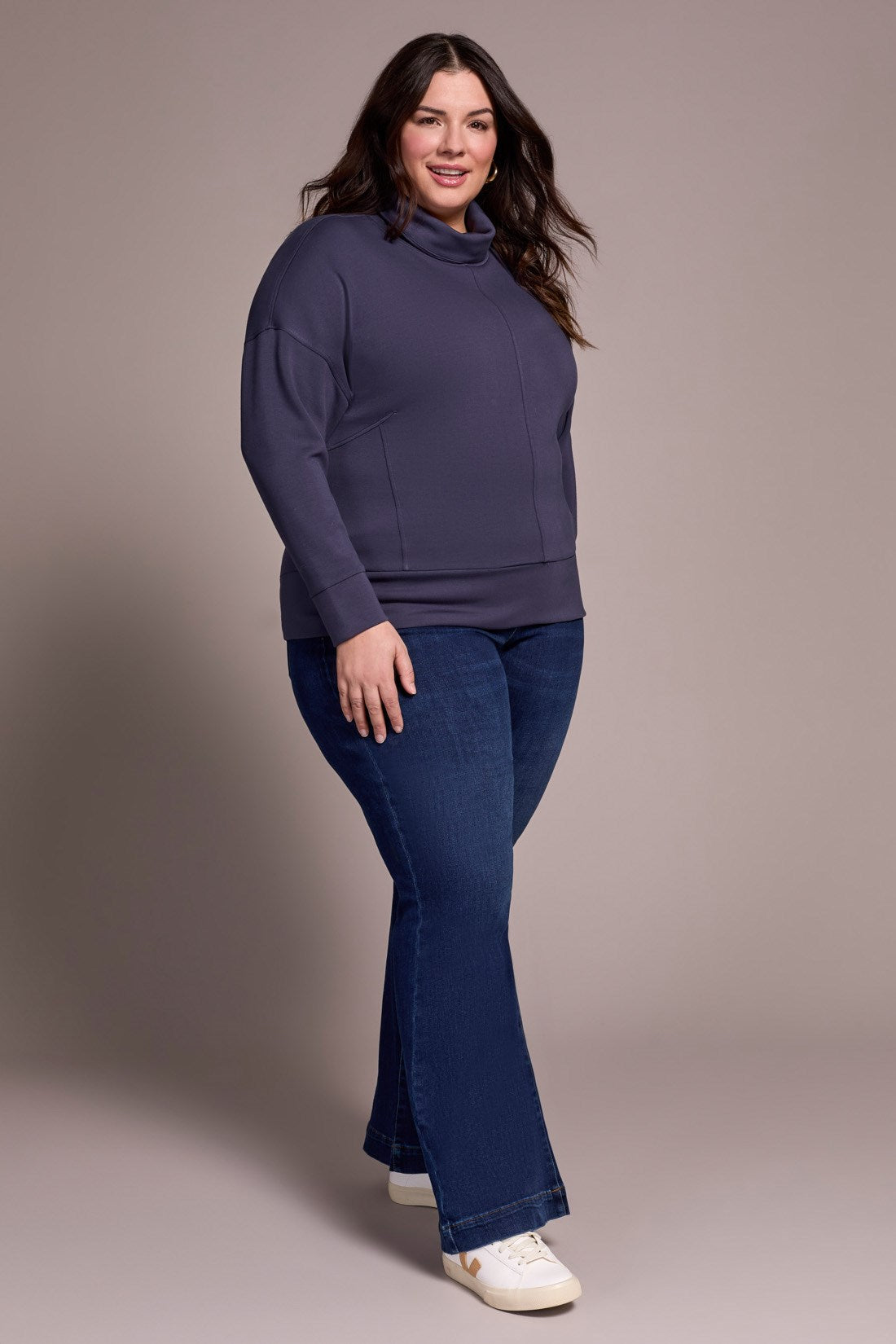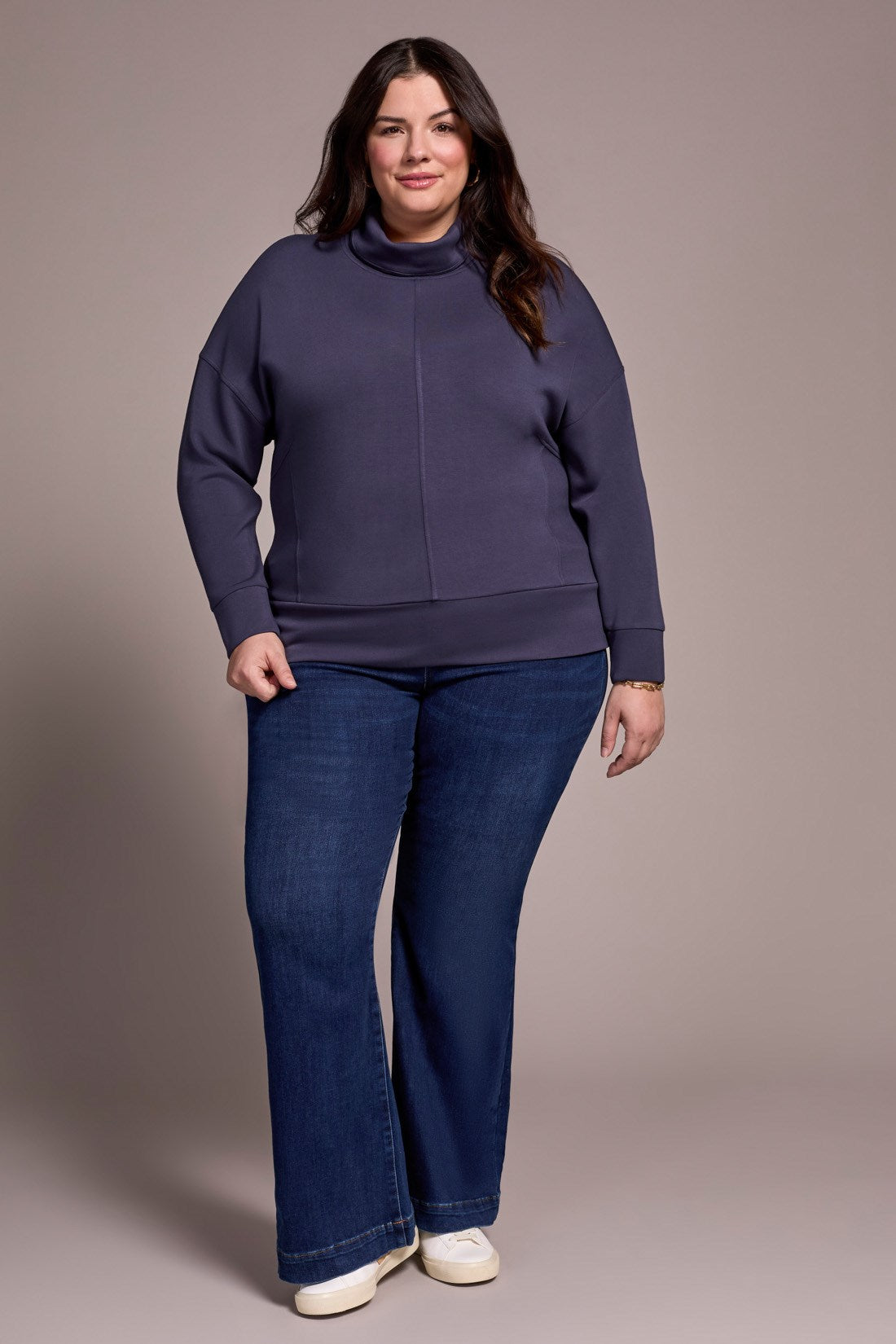 Elevate your casual wardrobe with this contemporary knit top, crafted from soft scuba fabric for a sleek, structured feel. The funnel neckline and drop shoulders create a relaxed yet polished silhouette, while front stitching adds subtle detail. Elasticated cuffs and hemline provide a comfortable fit, and long sleeves offer cozy coverage for cooler days.?