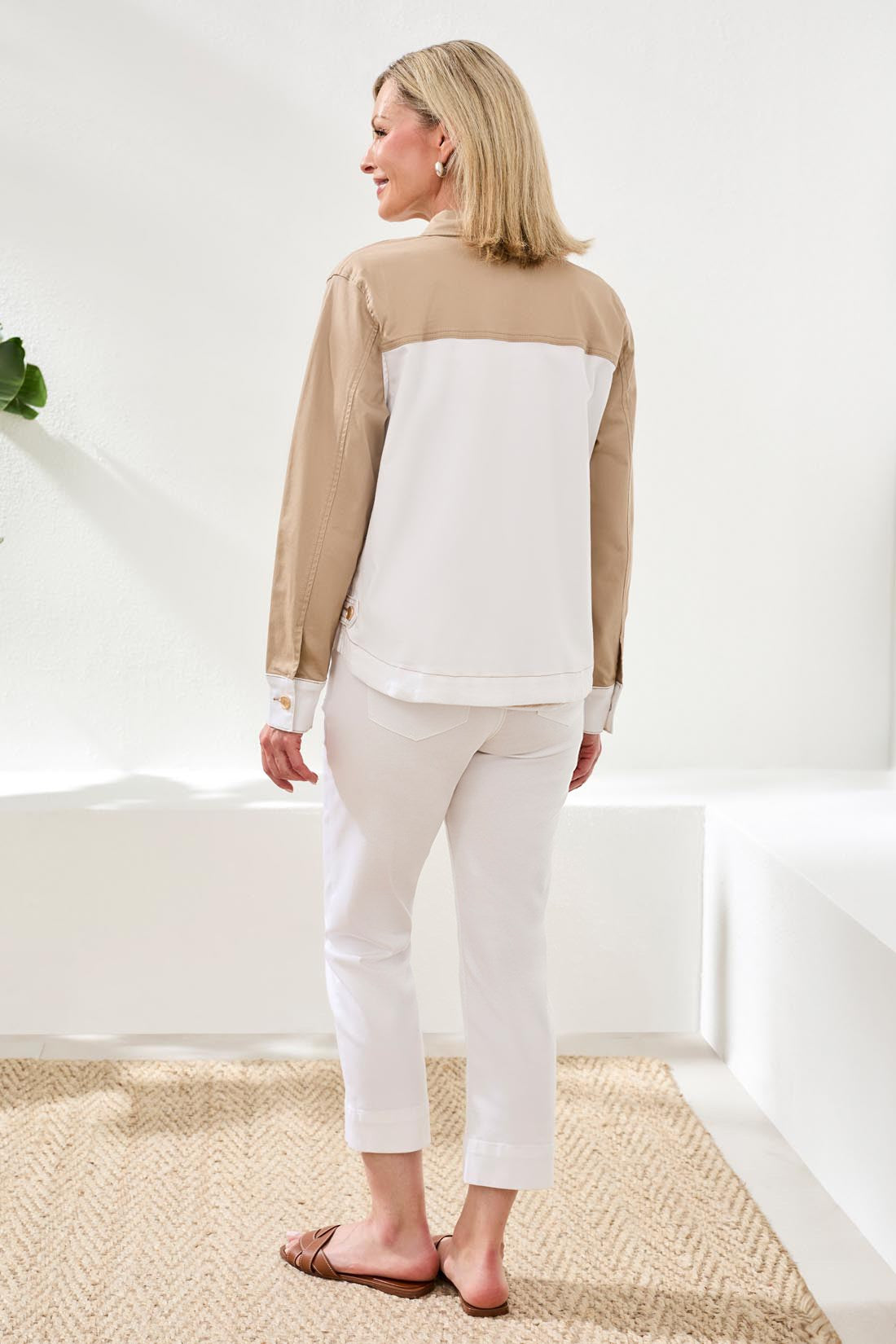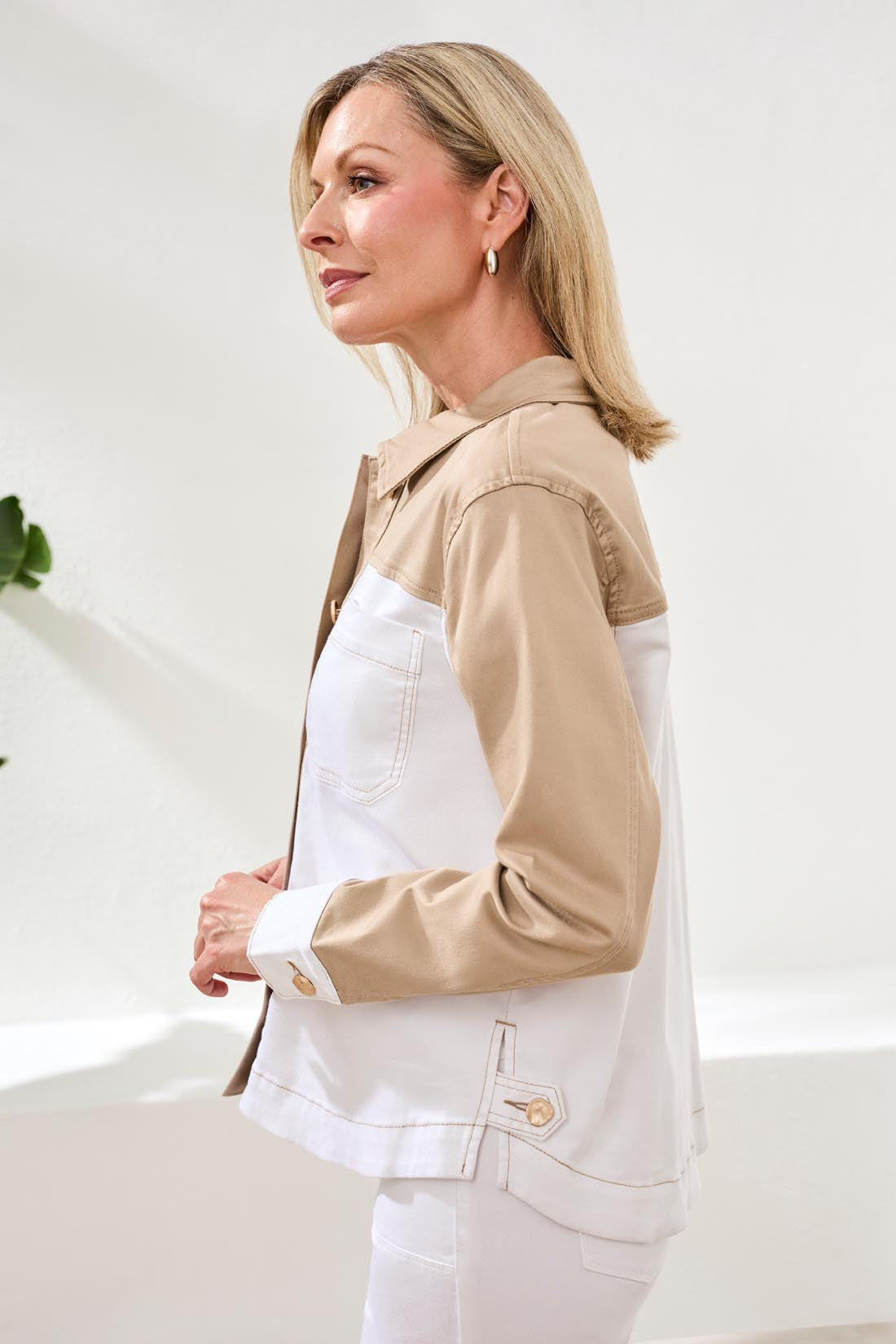 An elevated color block jacket crafted in stretch denim for modern impact. Statement-making and practical, it features a classic fit that layers with ease, taking you from casual outings to city adventures in comfort.