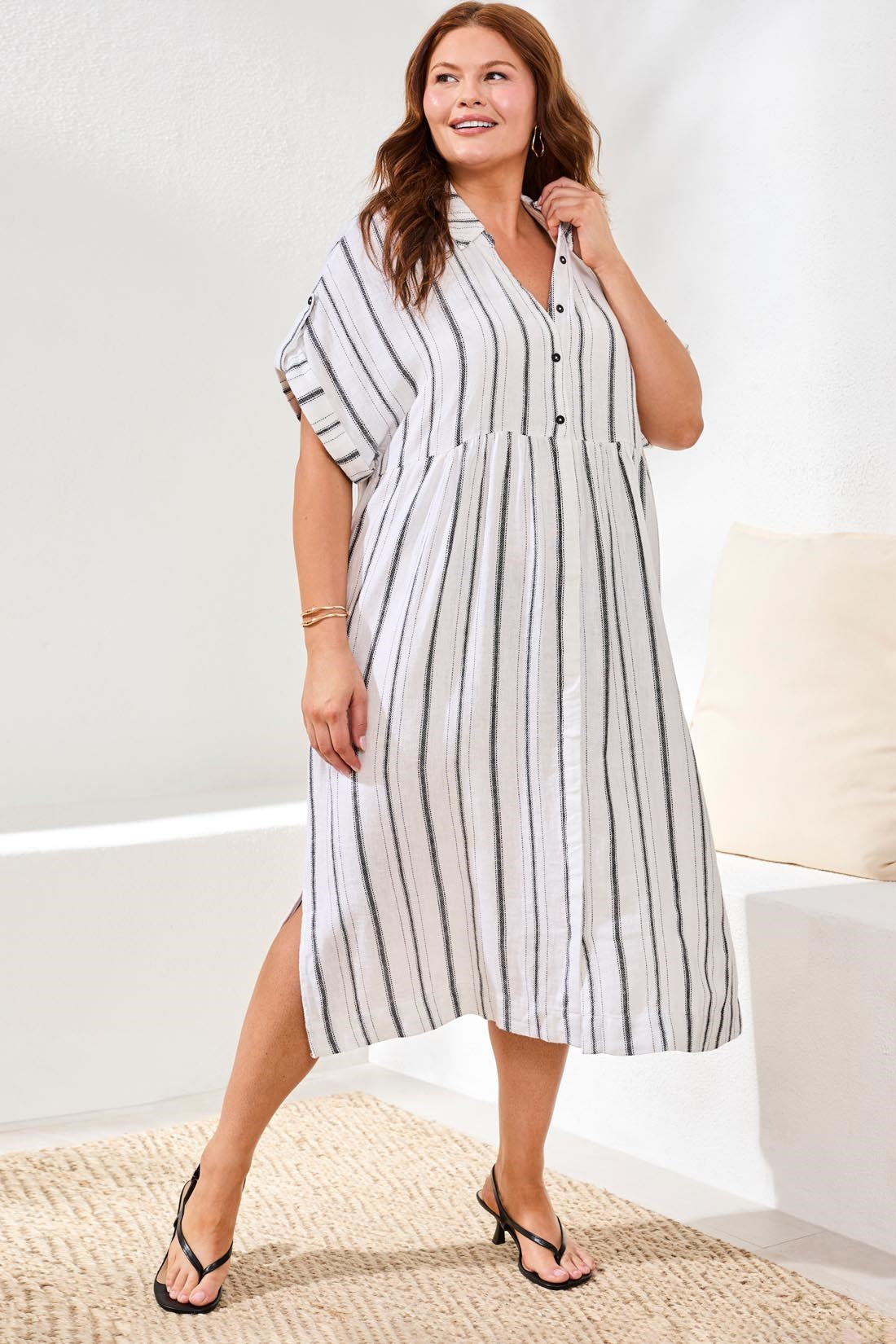 The size-inclusive version of our flowy yarn dye stripe shirt dress, offering the same airy linen-cotton blend, easy drape, and everyday comfort for all body types. Designed for effortless, confidence-boosting style wherever you go.