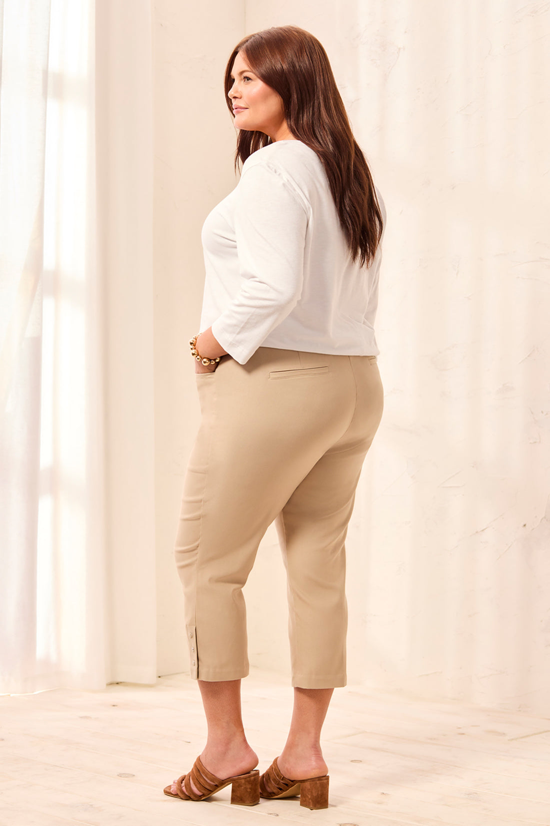 Designed for a flattering fit, these plus pull-on CAPRIS feature a slim silhouette and snap vent detail. Crafted in stretch century twill, they offer day-to-night versatility and effortless movement for workdays, weekends, or travel.