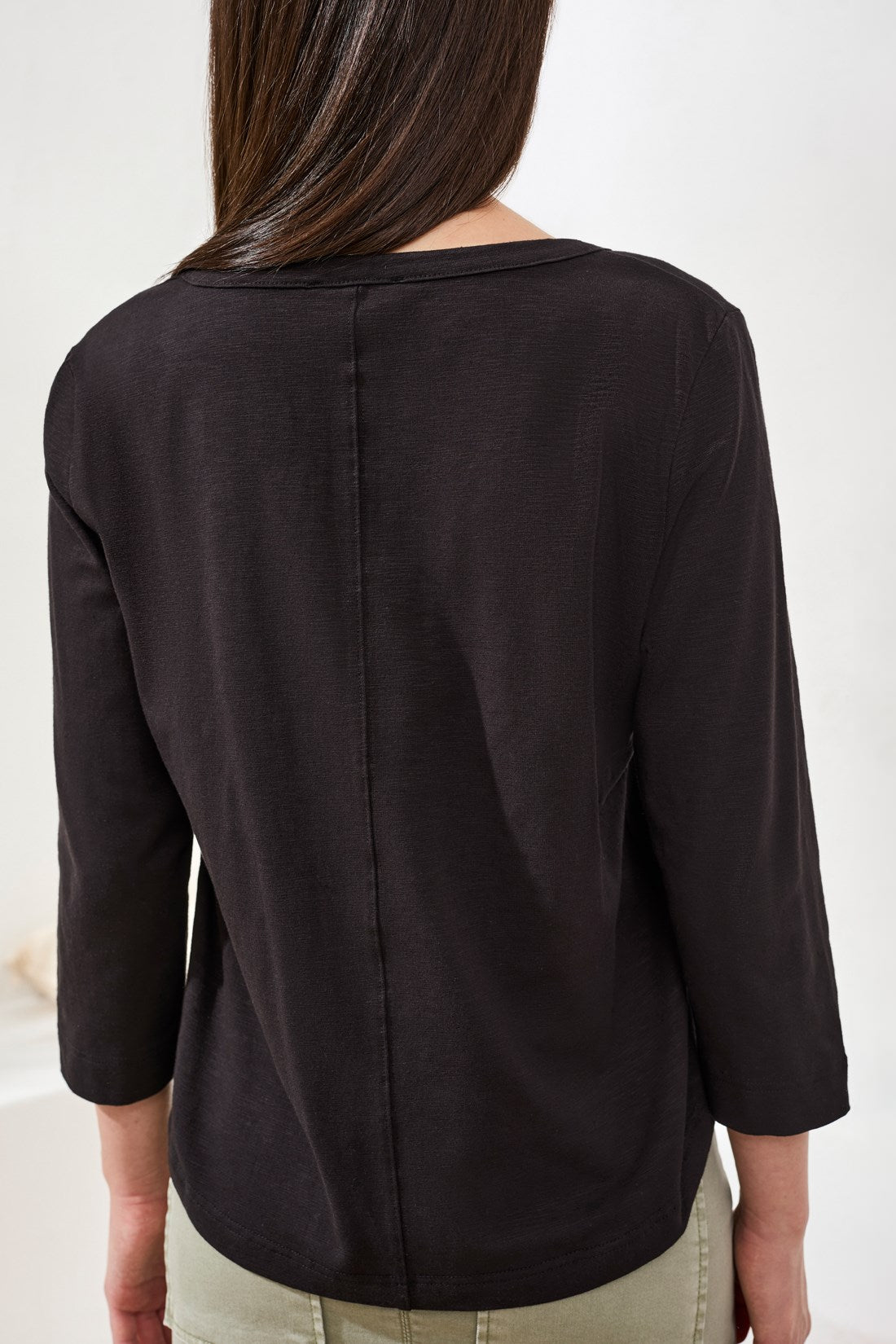 Button accents and a modern scoop neckline bring fresh detail to this 3/4 sleeve top, crafted from ultra-soft slub knit. The relaxed fit and breathable hand deliver comfort and style for spring days, travel, or layering throughout the season.