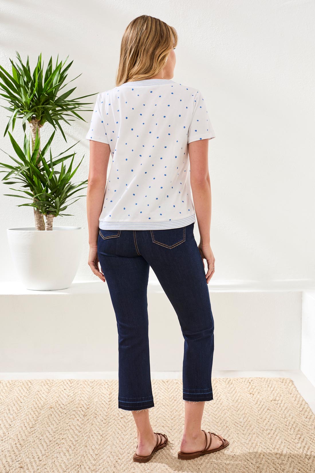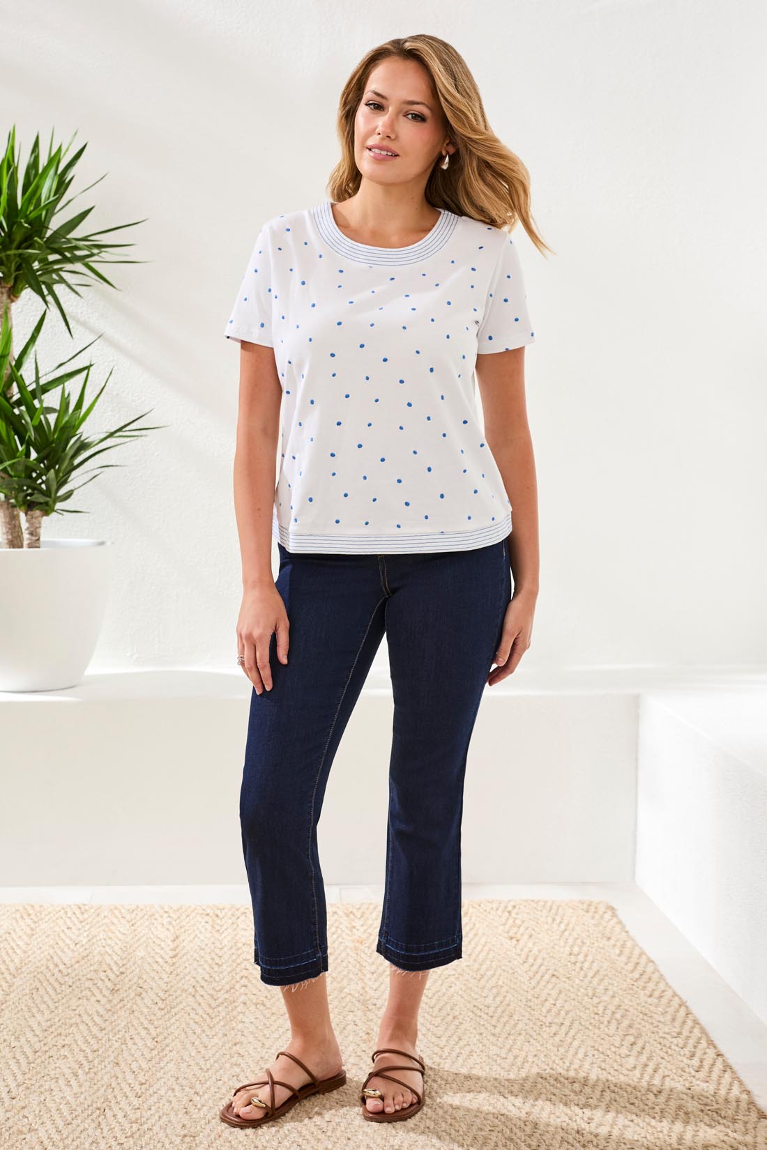 Refined with delicate embroidery, this 3/4 sleeve top features a crew neckline and a relaxed fit. The double yarn jersey feels soft against your skin, ensuring both comfort and effortless style for every occasion.