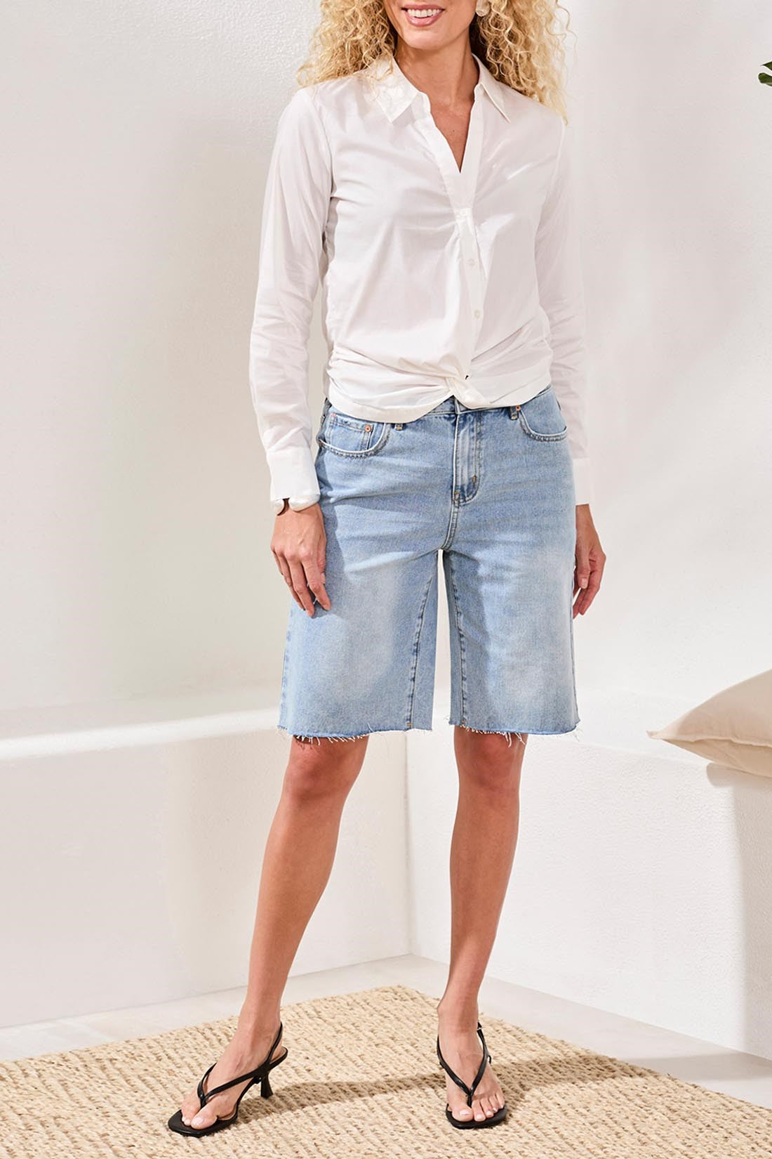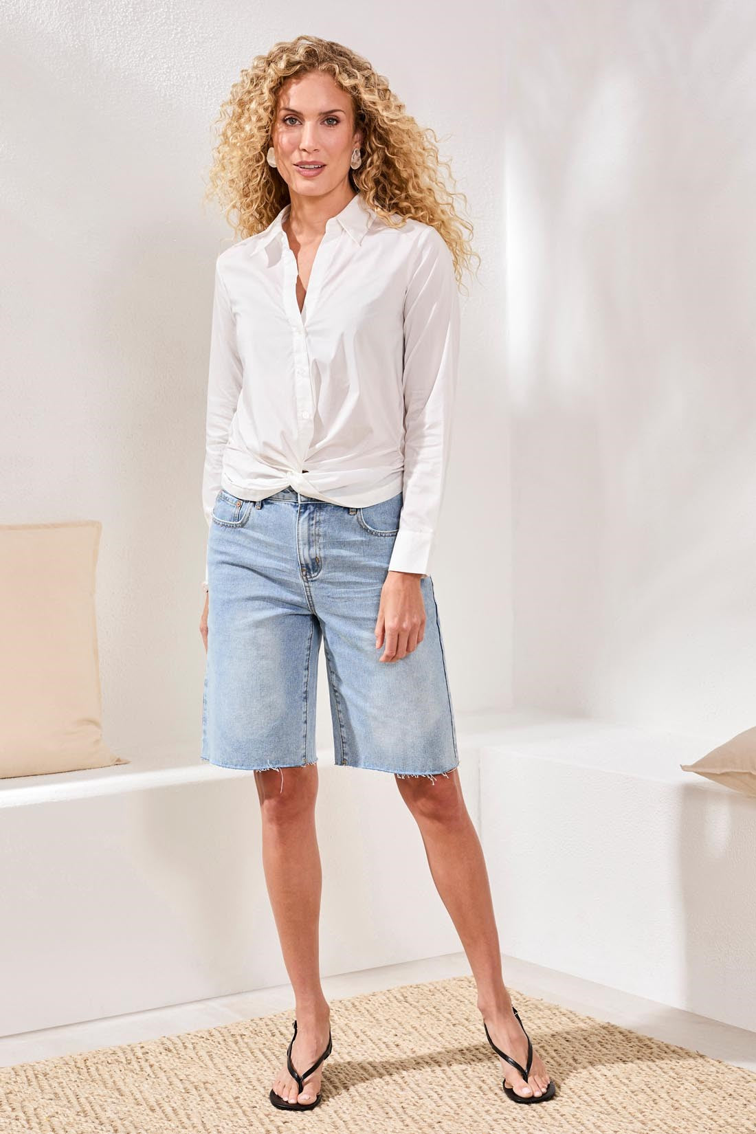 Refresh your look with this long sleeve knot front shirt, designed with a modern twist detail at the hem and a classic button front. The relaxed silhouette and lightweight woven fabric offer versatile style and all-day comfort for effortless, elevated dressing.