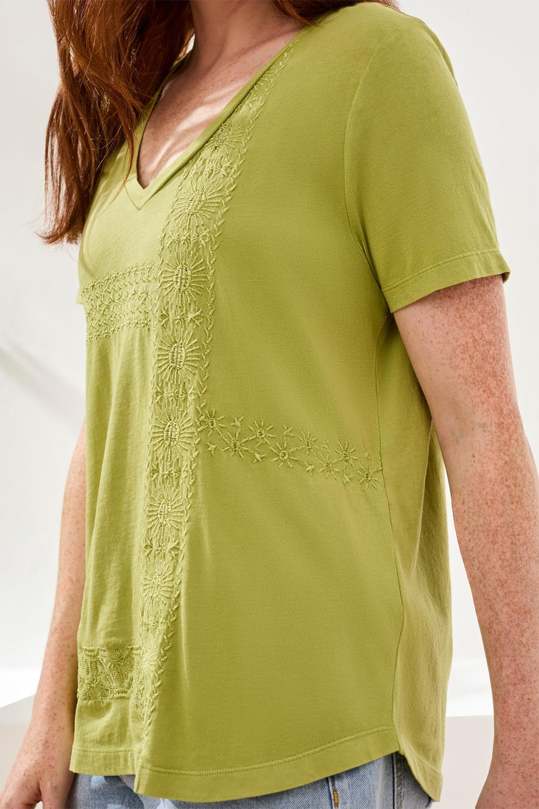 Elevate your look with this embroidered V-neck top, finished with a special wash for added softness and character. Crafted in soft touch cotton, it features delicate embroidery details and a relaxed fit, delivering everyday luxury and effortless style for workdays, weekends, and everything in between.