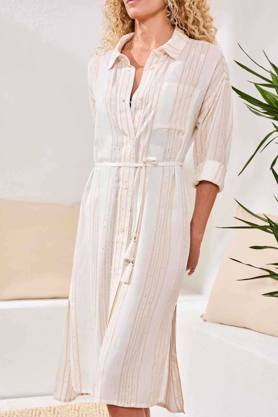 Lurex Jacquard Button-Front Cover-Up Dress With Roll-Up Sleeves