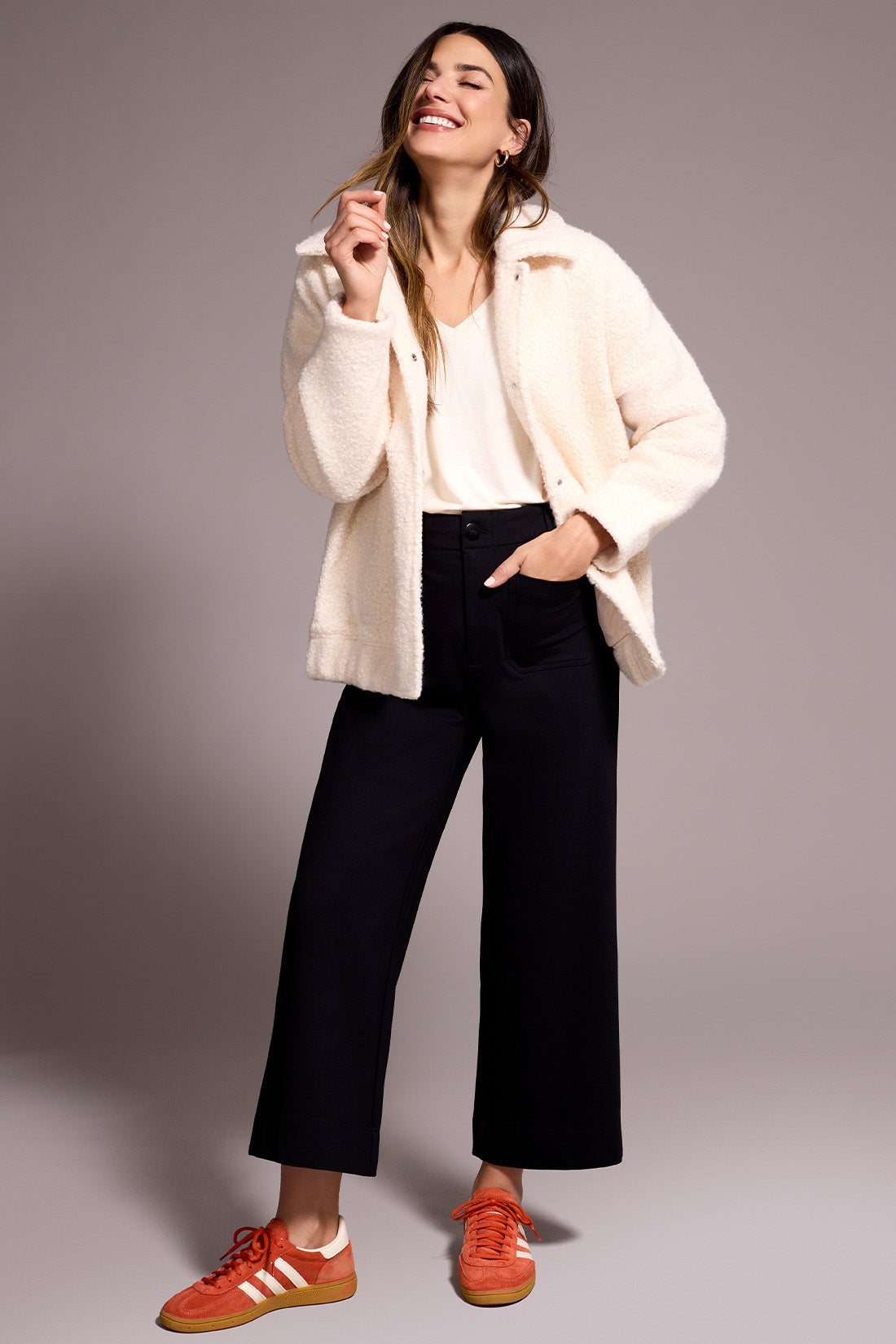 Move through the day with ease in these stylish and easygoing capri pants, designed with a flattering high-rise fit and relaxed wide legs. A classic fly and marbled button at the waistband add timeless appeal, while front and back pockets offer functional charm. Crafted from stretch ponte fabric, they deliver all-day comfort with a polished finish.