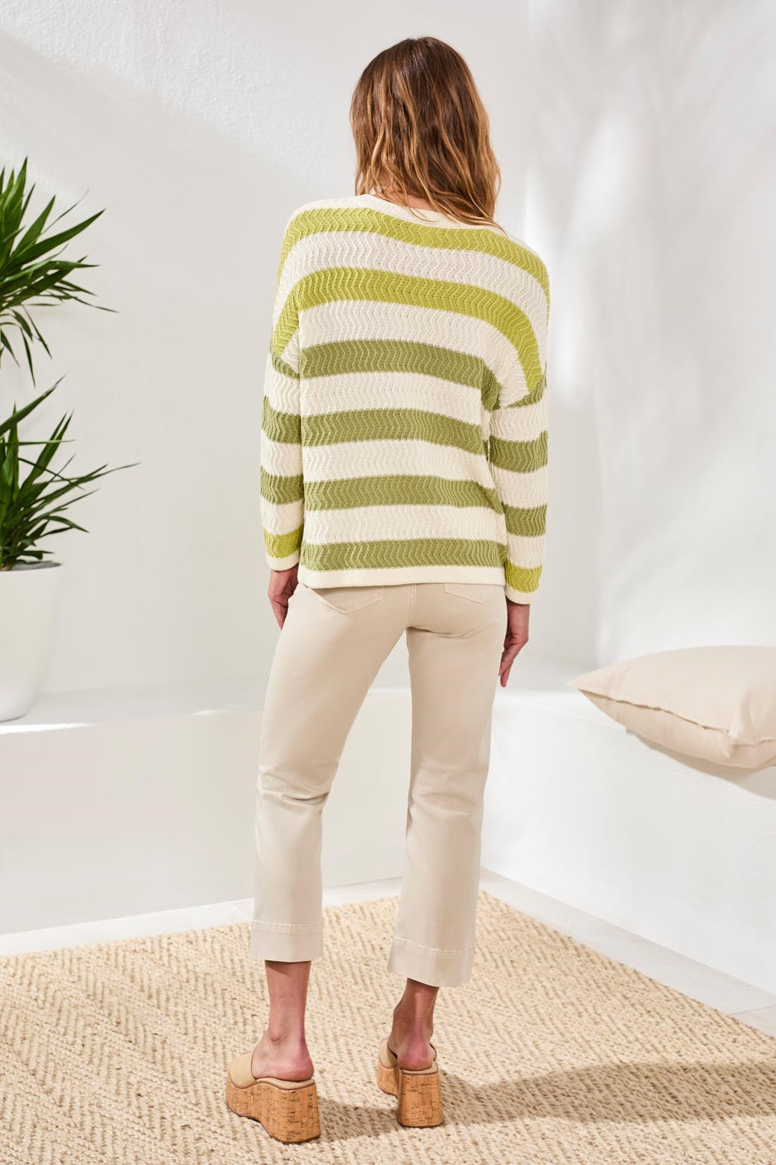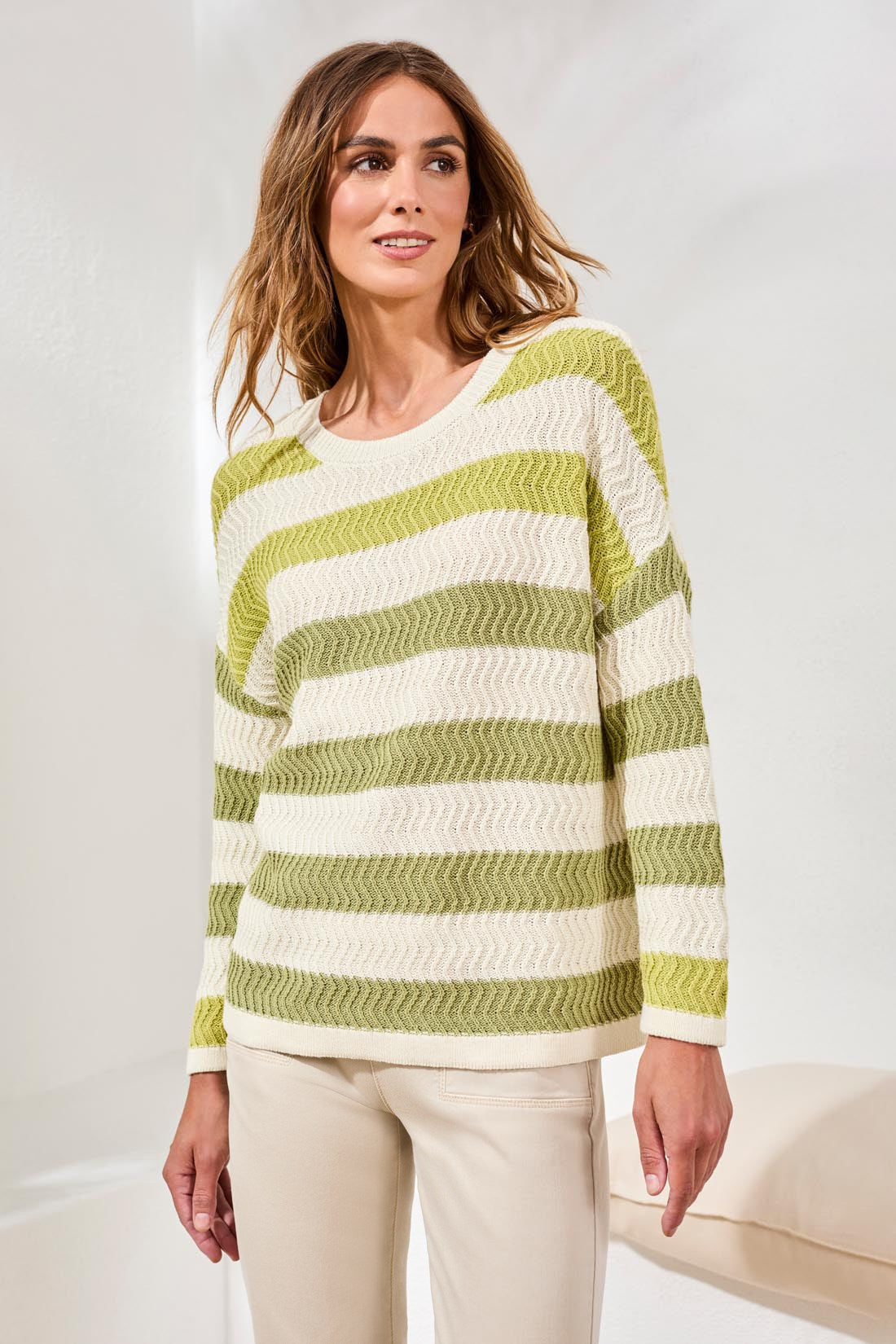This crew neck drop shoulder sweater, with 3/4 sleeves, is knit from premium cotton yarn with a special wash for extra softness. Its relaxed silhouette and breathable design offer all-day comfort, perfect for layering or wearing alone for a polished, modern spring style.