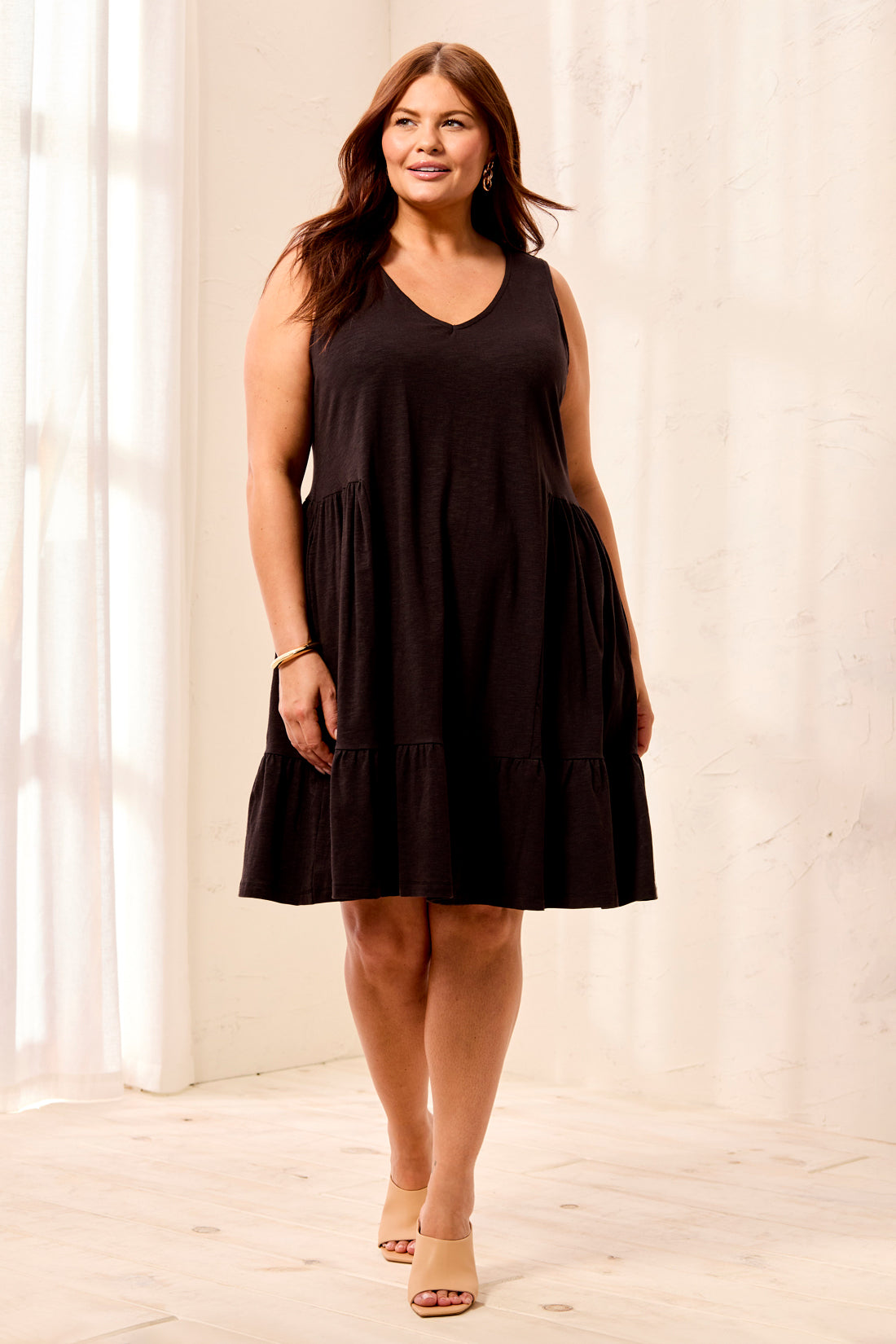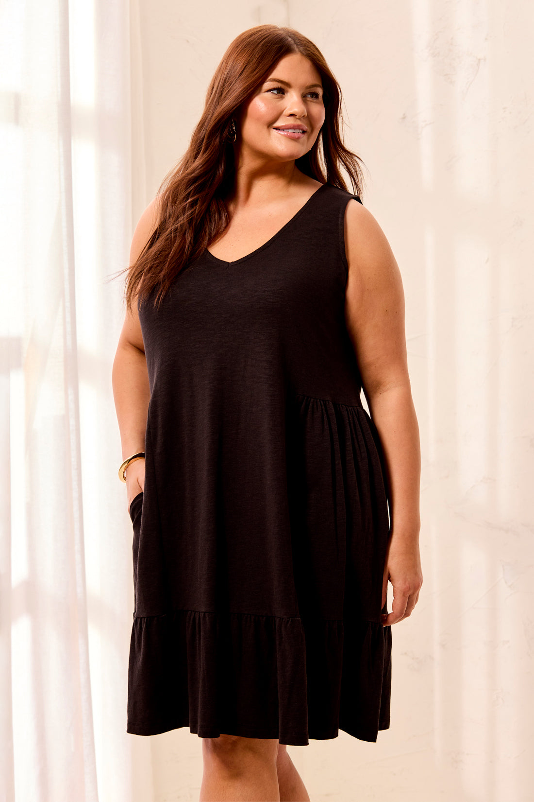 Embrace summer ease in this plus-size sleeveless v-neck dress, crafted from soft slub knit with a breezy, modern fit. The gentle drape and 36" length keep you feeling comfortable, polished, and free to move all day.