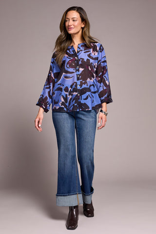 Embroidered Button-Front Short Sleeve Fringe-Trim Blouse