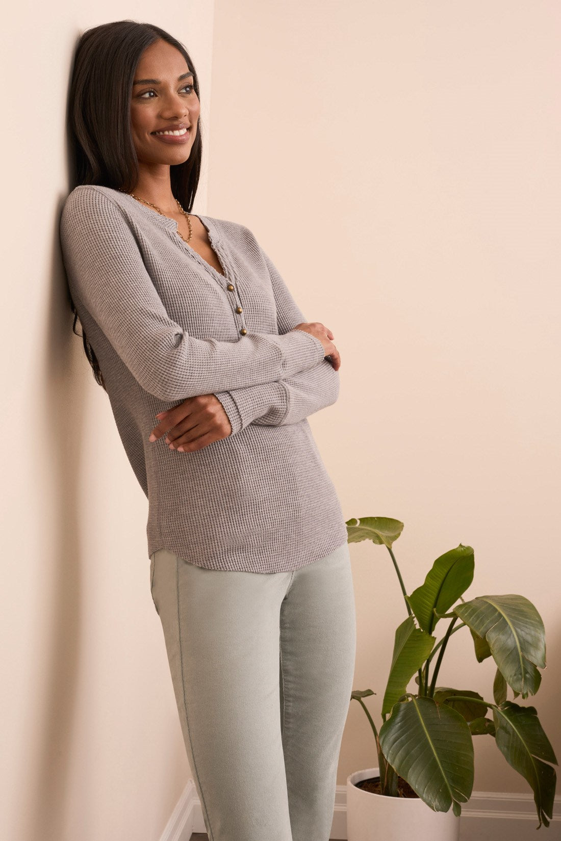 Cozy up in effortless style with this brushed waffle knit Henley top, designed for casual comfort with a textured twist. The soft, brushed finish adds warmth and a gentle feel against the skin, while the Henley neckline and long sleeves offer timeless, laid-back appeal, perfect for layering or wearing on its own.