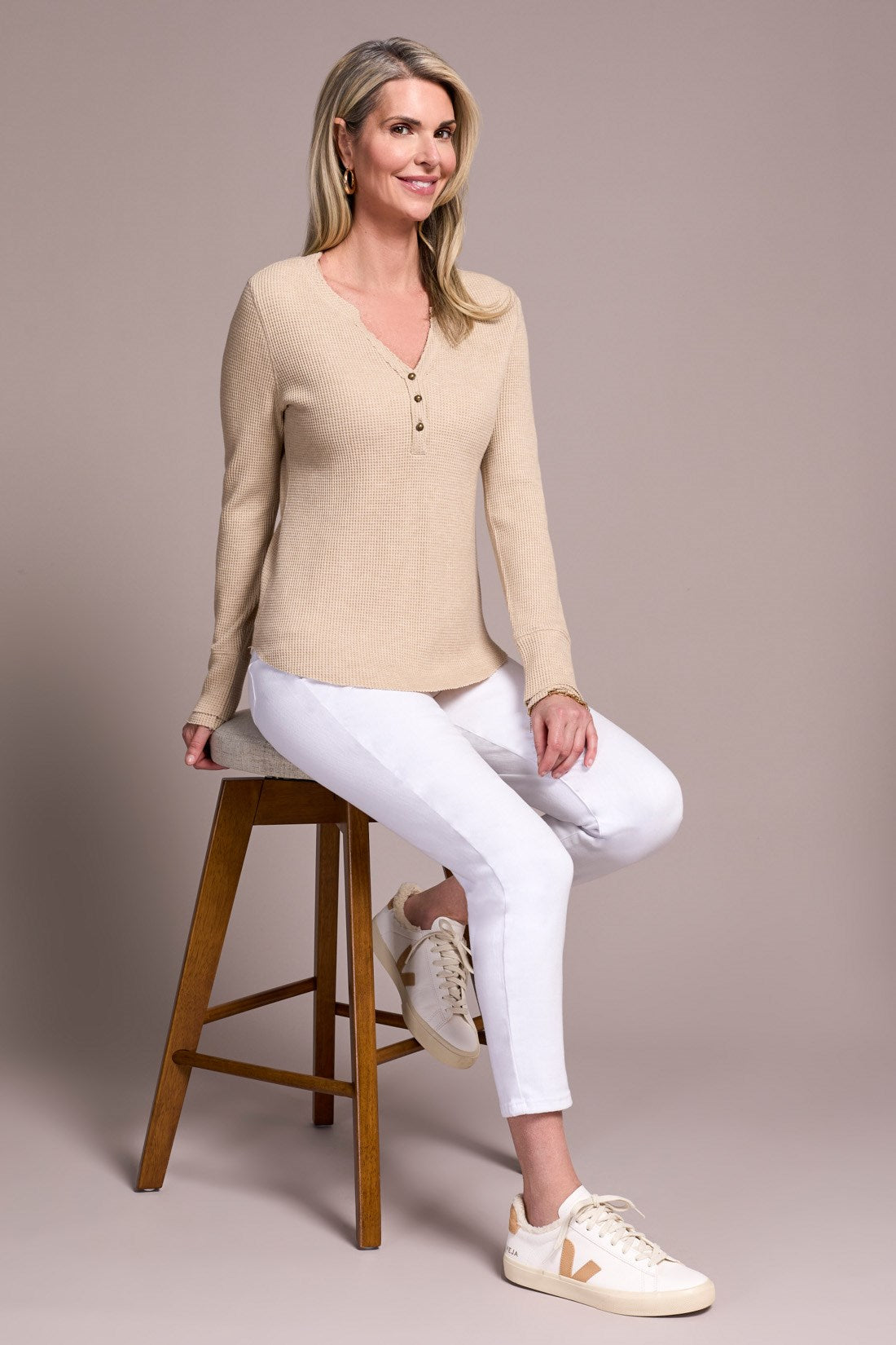 Cozy up in effortless style with this brushed waffle knit Henley top, designed for casual comfort with a textured twist. The soft, brushed finish adds warmth and a gentle feel against the skin, while the Henley neckline and long sleeves offer timeless, laid-back appeal, perfect for layering or wearing on its own.