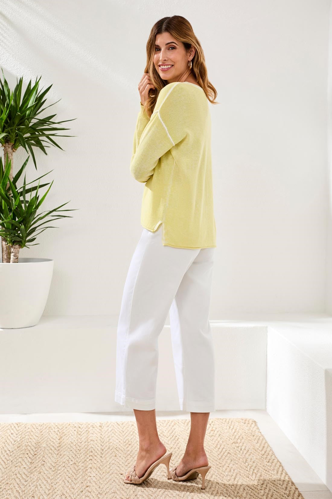 Lightweight and versatile, this v-neck sweater is an unbeatable match for laidback, fashion-forward style. We love the pop-over design, long sleeves with drop shoulders, exposed center seam, high-low hem with side-slit details, and four vibrant colors with a reverse bleach print that gives it a unique flair.