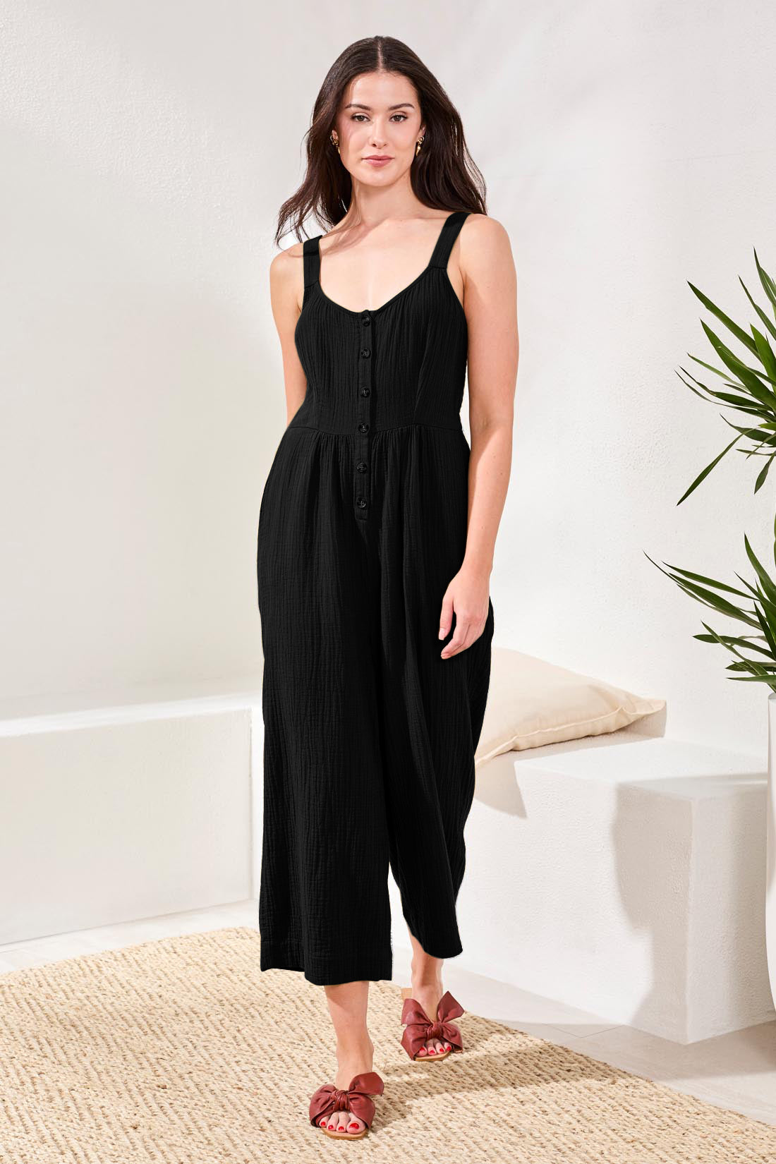 Cette combinaison en gaze froissée associe un dos smocké ajustable pour un tombé personnalisé. Légère et fluide, elle offre confort et style contemporain, idéale à porter au quotidien comme pour des occasions plus habillées.