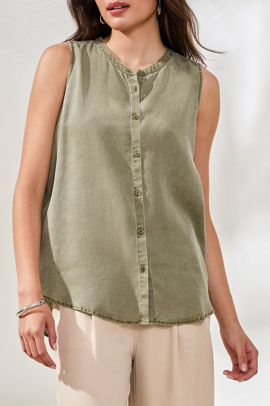 Cette blouse sans manches fluide, confectionnée en sergé cavalry lavé, offre un toucher doux et un drapé élégant. Sa coupe décontractée et sa forme fluide garantissent confort et polyvalence, idéale à superposer ou à porter seule comme pièce maîtresse.