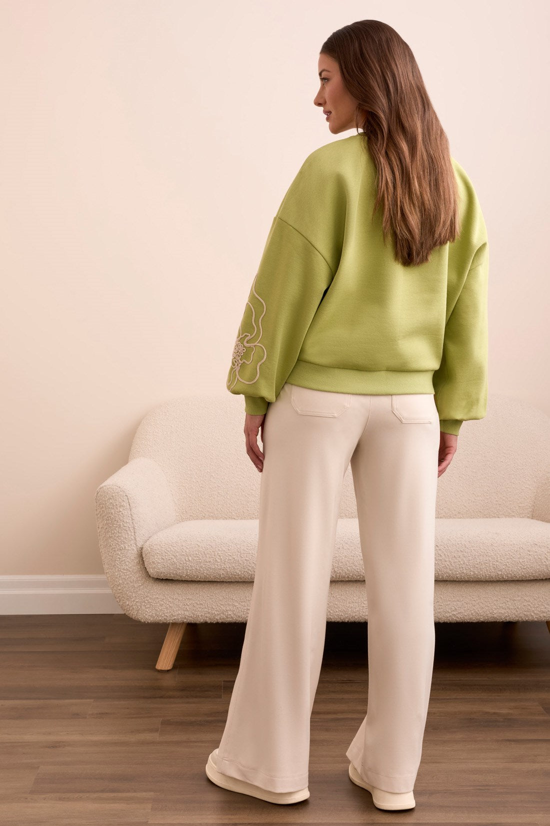 Les détails de fleurs brodées décorant l'épaule et le manche de cette blouse décontractée pour un charme élégant. Le tissu éponge brossé ajoute une texture douce parfaite pour la vie du jour.