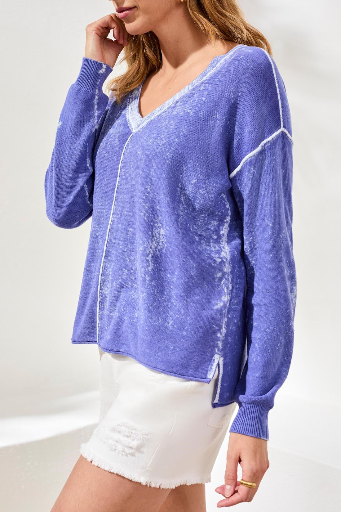 Léger et polyvalent, ce chandail à encolure en V est un incontournable du style décontracté et moderne. On aime sa coupe ample, ses manches tombantes, son ourlet haut-bas avec fentes latérales et ses couleurs éclatantes rehaussées d’un effet délavé inversé qui lui donne un charme unique.