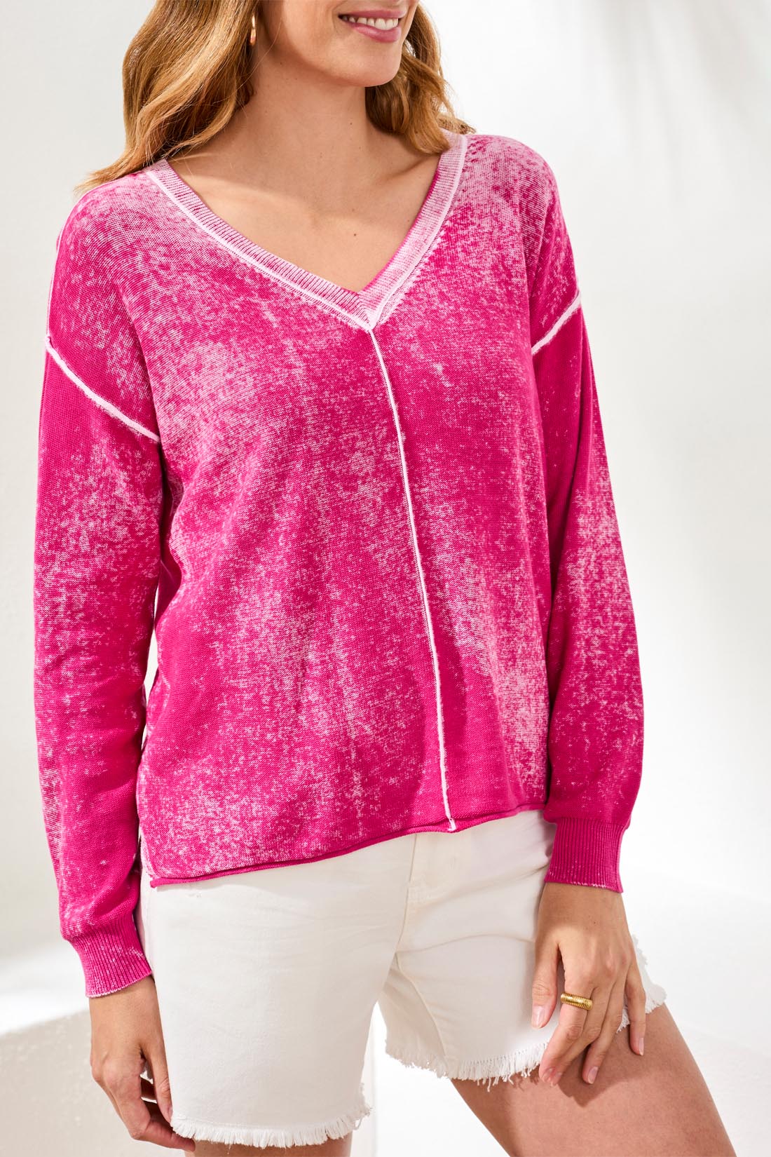 Léger et polyvalent, ce chandail à encolure en V est un incontournable du style décontracté et moderne. On aime sa coupe ample, ses manches tombantes, son ourlet haut-bas avec fentes latérales et ses couleurs éclatantes rehaussées d’un effet délavé inversé qui lui donne un charme unique.