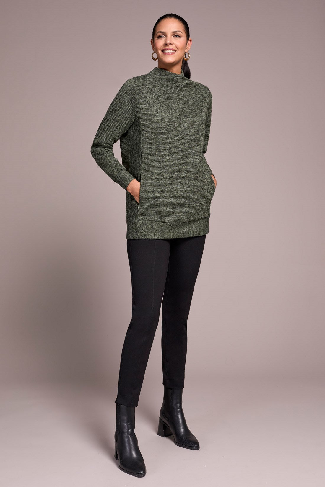 Choisissez le style confortable et décontractée avec cette tunique à poches cachées. La coupe longue et le col montant vous donnent de la couverture et les manches longues ajoutent de la chaleur. Le tissu tricot matelassé est parfait pour les journées froides.