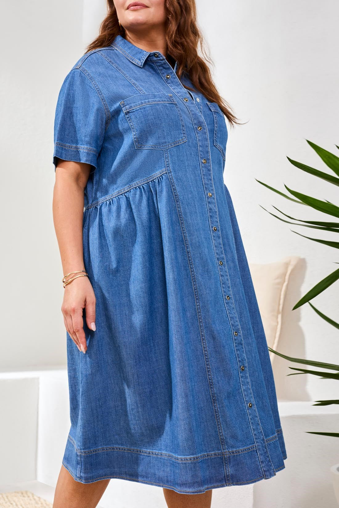 Conçue pour toutes les silhouettes, cette robe chemise fluide en denim tailles inclusives est réalisée en denim stretch léger pour une forme élégante et fluide. Avec ses poches pratiques et sa coupe décontractée, elle s’adapte à toutes les occasions, offrant confiance et aisance tout au long de la saison.