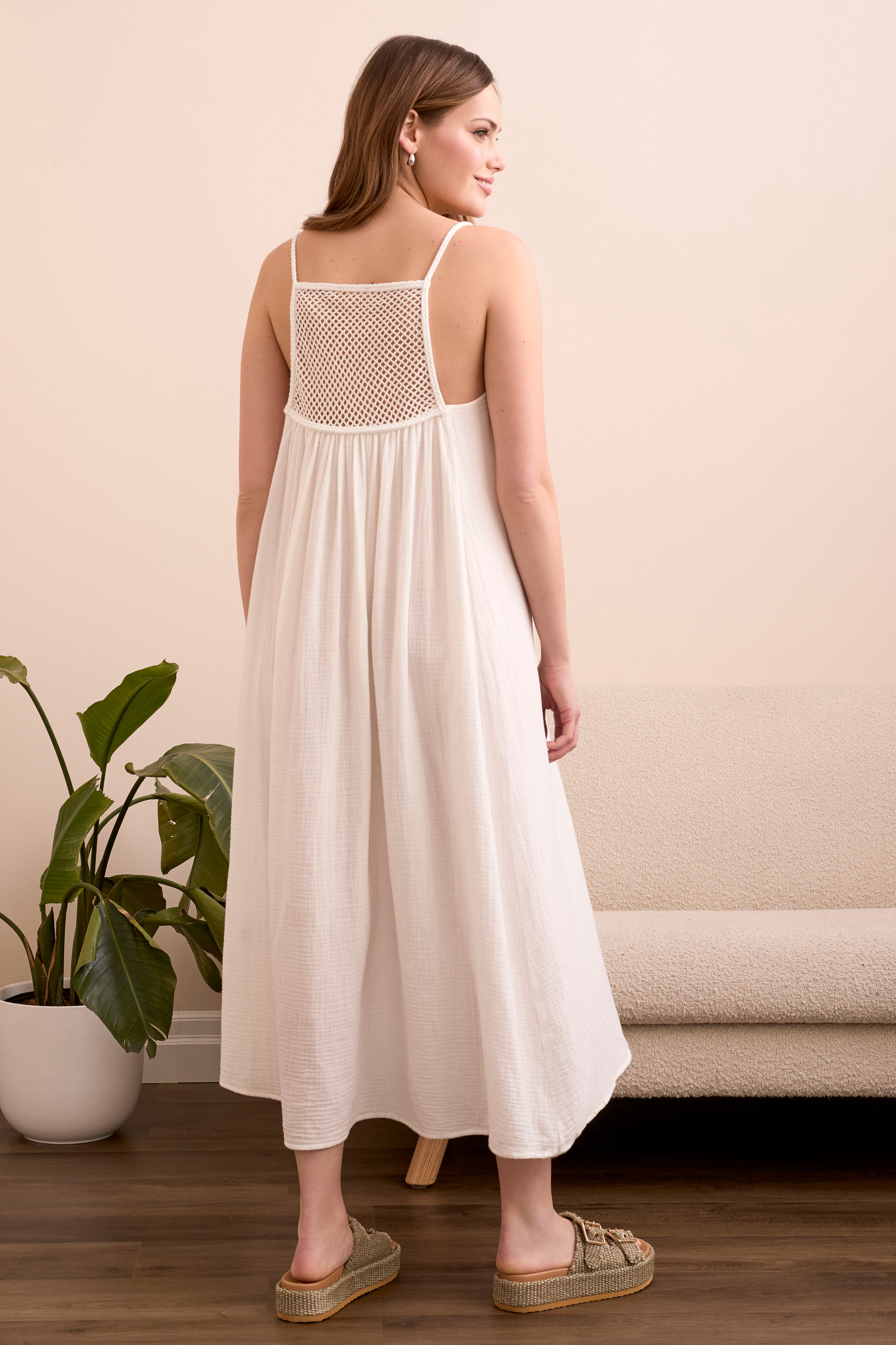 Stand out in this breezy maxi dress, featuring airy white gauze for effortless movement. Delicate seashell detailing subtly embellishes the poised V-neckline, adding a touch of coastal charm. Featuring a mesh crochet accent at the back, adding a hint of romantic allure.