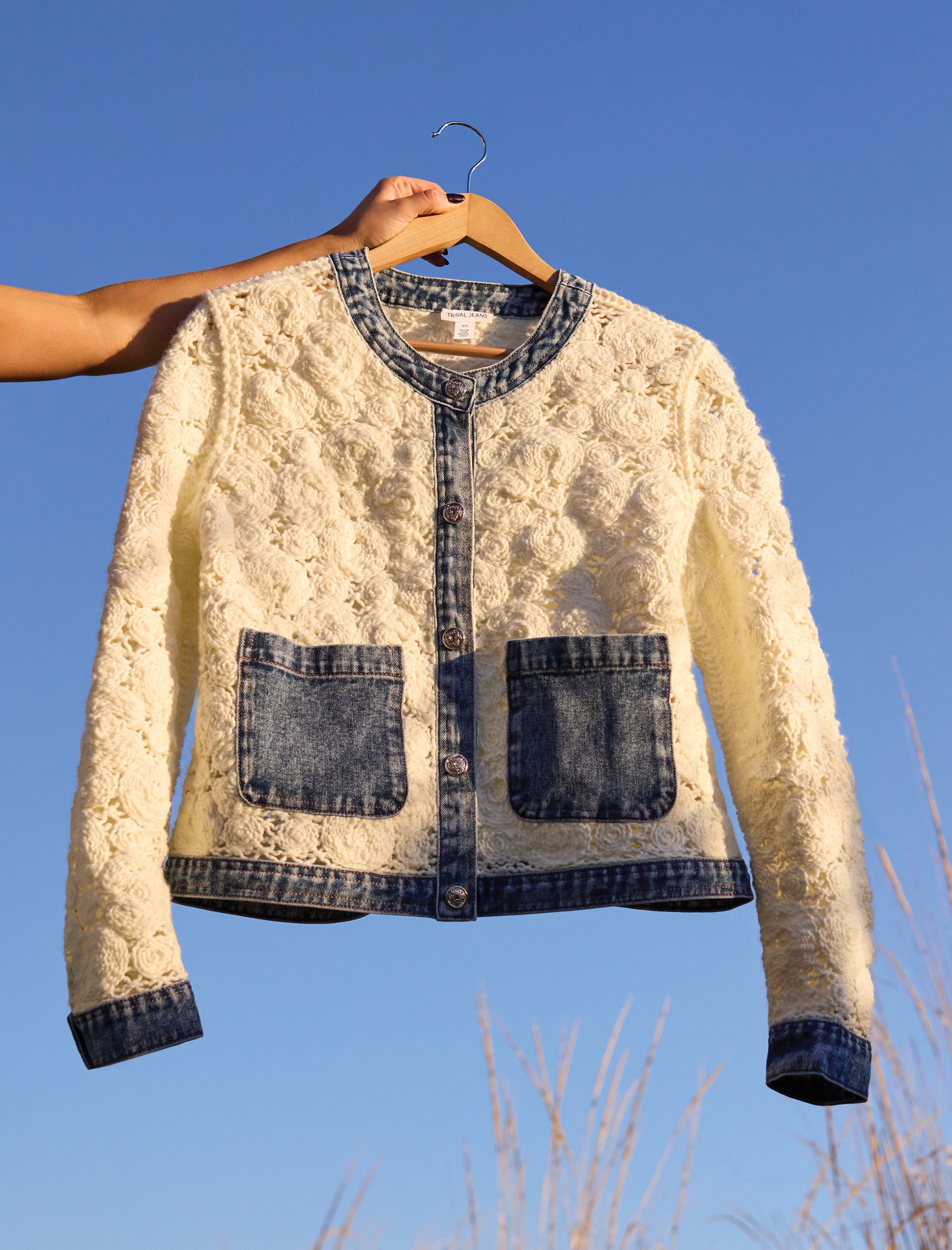 Infuse your wardrobe with effortless elegance in this airy jacket, featuring intricate floral crochet and accented by raw denim pockets and trim. The sleek buttoned front adds a refined finish, while functional front pockets bring a practical touch to this fashion-forward piece.