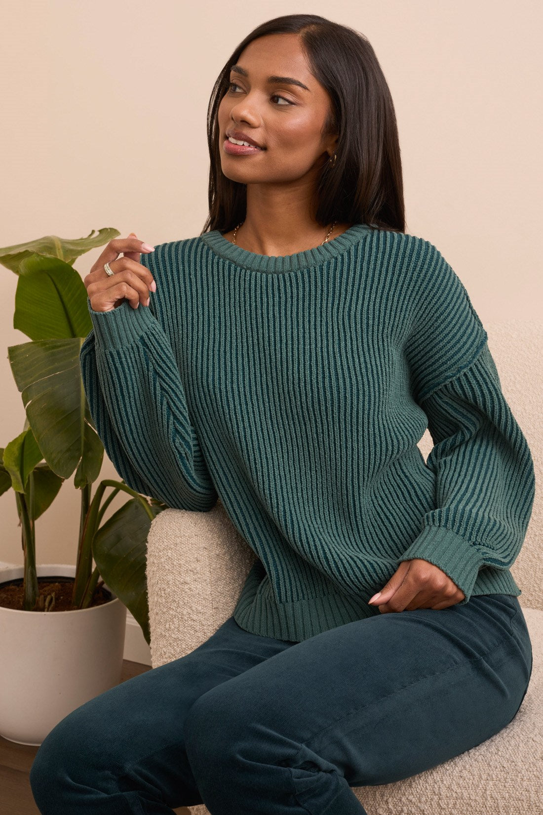 Cozy up in this crewneck sweater made from plaited chenille yarn for a luxuriously soft feel. The two-tone design adds depth and interest, while ribbed detailing at the collar, sleeves and hem brings a polished finish. Side slits offer freedom of movement and ventilation, and the long raglan sleeves provide a relaxed, comfortable fit.