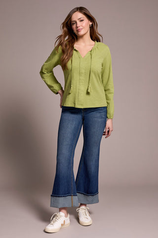 Infuse your look with boho charm in this relaxed top, featuring a split neckline with draping tassel-tipped ties for a free-spirited touch. Long sleeves with elastic cuffs offer versatile styling, allowing you to wear them long or pushed up for a more laid-back vibe. The breathable cotton slub fabric ensures comfort, making it perfect for warmer days.